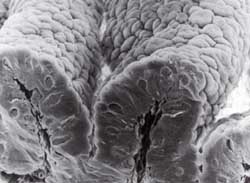 ![]() SEM photomicrograph of tobacco hornworm midgut by Kevin Wise But larval gluttony comes with certain physiological problems, which have long interested Moffett. Plant leaves, the caterpillar’s cuisine, are high in potassium and low in sodium. In contrast, much of basic physiology depends on a model high in sodium and low in potassium. In fact, says Moffett, were a traditional medical physiologist to examine the blood of a caterpillar, she would declare it impossible. Moffett has explained the mechanism by which the midgut of the tobacco hornworm secretes potassium through its membrane. In the process, Moffett also got interested in another oddity of the larval midgut. It generates extremely alkaline conditions, again the opposite of what is considered the norm. Whereas the human stomach generally has a pH of around 2, the caterpillar’s stomach has a pH as high as 11 or 12. Moffett recalls peeling back the grass in his back yard as a child and discovering the fascinating creatures that lived there. “It’s been like that ever since,” he says. “Gee, that’s interesting.” But the reality of research funding has shifted to priorities more practical, and less curiosity-driven, than ion transport in the caterpillar mid-gut. So Moffett was moved to ask what else among insects secretes alkali. The mosquito larva, it turns out, which is a major vector of disease. Do lepidopteran larvae and mosquito larvae have anything in common other than an alkaline stomach? And might the larvae’s uniqueness also be their Achilles’ heel? Moffett has recruited a post doc who has experience working with tiny tissues, and together they are exploring the possibilities. Meanwhile, Moffett was rewarded for his basic curiosity by being elected this year as an American Association for the Advancement of Science Fellow.