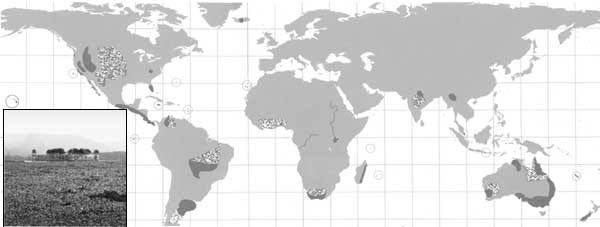 ![]() This map, compiled by botanist Richard Mack, estimates the Earth’s surface on which vegetation is now dominated by alien species (blackened) and those areas on which alien plants are prevalent, but not yet dominant (stippled). Not only does the history of plant invasions span thousands of years, Mack argues,“their collective impact has been truly global.” In contrast to currently discussed forms of global change, plant invasions have already “wrought permanent consequences.” A South American native, the water hyacinth (Eichhornia crassipes) is one of the worst weeds in the world. Hyacinth populations can double in 12 days. In Jaipur, India, water hyacinths cover what should be open water. In Queensland, Australia, a noxious weed known as the rubber vine, Cryptostegia grandiflora, was introduced to gold mine areas. It has ruined grazing lands and threatened native forests. Kudzu (Pueraria thunbergiana) was first introduced to the United States at the Philadelphia Centennial Exposition in 1876. People planted it as a shade vine for porches and arbors. During the Depression, the federal government paid farmers to plant kudzu for erosion control. Now it overwhelms much of the southern U.S. It can grow up to a foot a day. | C O N T E N T S | H O M E | |