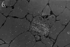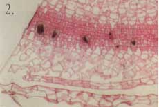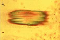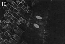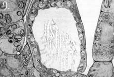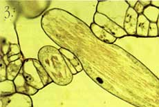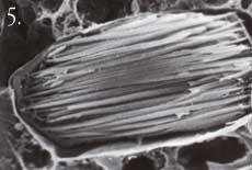 *A micrometer is 1/1,000,000, or 1 x 10-6 meter. 1. A water lettuce plant (Pistia stratiotes) taken with a macro lens and 35 mm camera. This is the level of resolution we commonly use to observe the world around us with our eyes. We can clearly see that the plant is made of various parts (organs), and we can deduce certain biochemical features based on our general knowledge of plants. (For example, it is green and therefore likely to exhibit photosynthesis.) But we can't see what the plant really looks like or how it functions at the tissue or cellular level without the aid of additional tools. For example, how does this plant cope with the relatively large amounts of calcium it is exposed to in its environment? Calcium is an important nutrient that is tightly regulated at the cellular and subcellular level in all living organisms. ![]() 2. Here is a one-micrometer-thick section through a leaf of a water lettuce plant. The plant has been exposed to radioactive calcium, then processed to allow for visualization of where calcium has accumulated at the tissue and cellular level. The radioactive calcium appears as small dark particles. Calcium is accumulating in specific cells, which appear grayish or black among the non-accumulating cells stained red/pink. Using light microscopy with this technique, we can see that the plant has specialized cells designed for regulating calcium levels in the leaf. This view does not tell us much about the special features of this cell type, though. ![]() 3. This section through the leaf has been photographed at higher magnification with a light microscope and gives some detail on the specialized calcium-accumulating cells, which we call idioblasts. The idioblast is elongated relative to surrounding cells and has calcified material in the vacuole. ![]() 4. Calcified material often is crystalline in nature and can be viewed using polarizing filters with the light microscope. This photograph shows the material in the vacuole is clearly crystalline in nature and may occur as a bundle of individual crystals. However, because of the relatively short depth of field of the light microscope objective lens, it is difficult to get a clear view of the individual crystals. ![]() 5. By using a scanning electron microscope (SEM), a three-dimensional image of the crystal can be obtained. The SEM has much greater depth of field and also high resolution through the use of electrons (very short wavelength compared to visible light) for image formation. In this picture we see an idioblast that has been cleaved open, revealing the crystals in the vacuole. The crystals are clearly seen as four-sided structures with pointed ends. The SEM view also demonstrates that they are packed into a bundle within the idioblast. 6-8. While calcification is common in animals (bones, teeth, etc.), not much is known about such processes in plants. The crystals in water lettuce are known to be made of calcium oxalate, and it is of interest to determine how they grow within the idioblasts. Using plants exposed to radioactive calcium, followed by specialized preparation techniques, we can show that the cell carefully controls crystal growth. We also find that growth of individual crystals is bi-directional. A laser scanning confocal microscope was used to generate the following images, which reconstruct crystal growth in water lettuce crystal idioblasts. The silver grains produced by decay of the radioactive calcium are imaged by laser light scattered from them, and the tissue section is imaged by the laser light transmitted through it. The confocal microscope can then combine the two images to give a "map" of radioactive calcium at the subcellular level. Thus, microscopes can be used to show dynamic events at the cellular level. ![]() 6. A very young developing idioblast with very small crystals. ![]() 7. A slightly older idioblast showing that the middle of the crystals is no longer adding calcium (not growing) while growth is clearly occurring from both ends of the crystals within the bundle. ![]() 8. A nearly mature idioblast showing growth occurring only at the very tips of the long crystals within the vacuole. ![]() 9. It would be interesting to see what structures within the idioblasts help regulate calcium accumulation. However, the resolution of the light microscope is limited by the wavelength that is possible to use for illumination, and very small structures are not clearly resolved. By using electrons that have very short wavelengths, the transmission electron microscope (TEM) can give tremendous improvement in resolution. This picture of an idioblast was taken with a TEM at relatively low magnification. However, a trained cell biologist will see that the idioblast cell has some very different features from a "typical" cell, including an abundance of endoplasmic reticulum (ER), the dark lines running through the cytoplasm. This organelle is known to be involved in calcium transport. In order to get a TEM image, very thin sections have to be made (60 nanometers*), while this cell is about 100 micrometers long. Thus, it is sometimes difficult to tell if the image is representative of the entire cell without much additional work. ![]() 10. Cellular probes developed for fluorescence light microscopy can be used to overcome the problem of determining if an image seen in TEM is representative of the entire cell. Although the resolution will not be as good as with TEM, in combination with laser scanning confocal microscopy entire cells can be imaged at fairly high resolution and in a living state! This image shows the distribution of endoplasmic reticulum in cells within a living piece of water lettuce leaf as seen with the confocal microscope. The intensity of fluorescence is a direct indication of the relative abundance of ER in the cells. The very bright green cells are all young crystal idioblasts. This technique clearly demonstrates that this cell type has large amounts of ER compared to